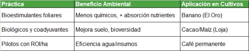 Nuestras soluciones contribuyen a la sostenibilidad regional al llenar "huecos" en el mercado de productos avanzados, menos saturados que los fertilizantes NPK tradicionales. En provincias como El Oro, donde el banano domina, los bioestimulantes potencian la resiliencia climática y reducen emisiones, apoyando exportaciones responsables.